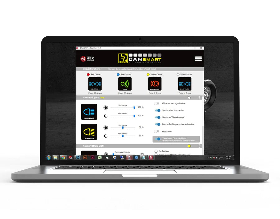 The CANsmart's four circuits are preprogrammed to connect and independently control two sets of DENALI lights, a SoundBomb horn, and our B6 auxiliary brake light.